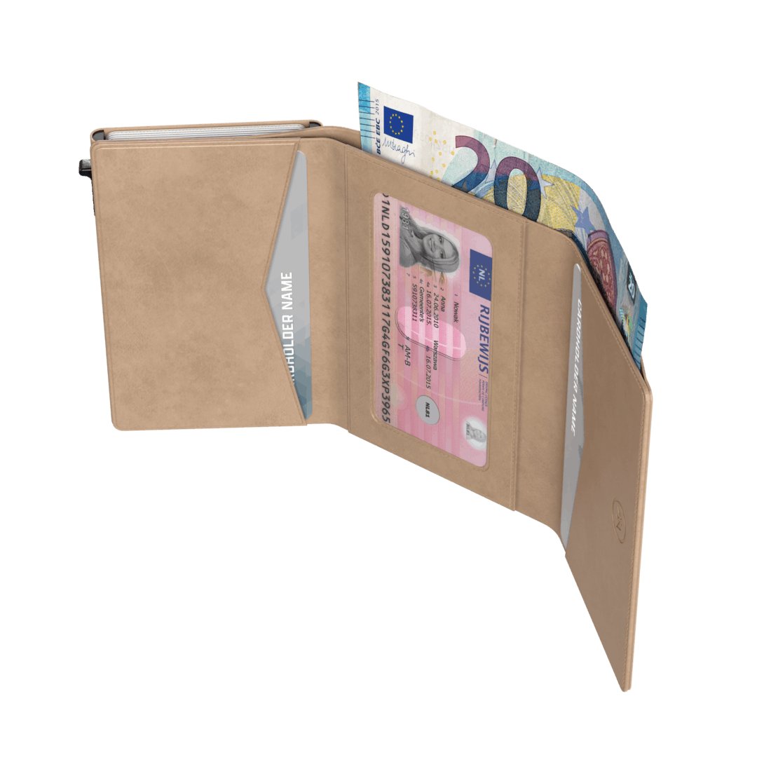 Terwijl de pasjeshouder niet dikker is dan 2,7 cm en breder dan 7,4 cm biedt hij evenveel opbergruimte als een klassieke portemonnee. Om precies te zijn: 9 pasjes: 6 in de kaarthouder en 3 extra aan de binnenzijde, muntgeld, briefgeld en zelfs visitekaartjes. Zo heb je jouw betaalmiddelen altijd stijlvol in je broekzak.